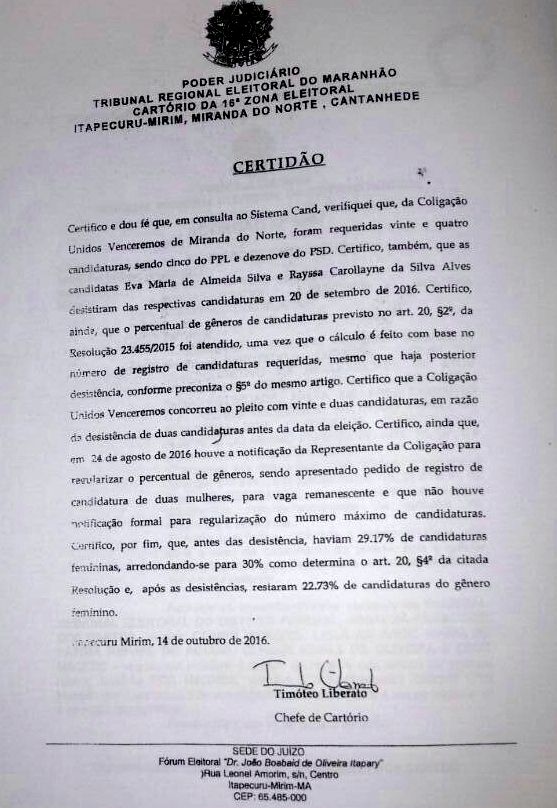 Uma representação impetrada na 16ª zona eleitoral contra a coligação Unidos venceremos (PPL/PSD) com base no § 3º do artigo 10, da lei 12.034/2009, requerendo a anulação da Coligação por conta da não observância do percentual determinado na cota de gênero que estipula 30% das vagas para mulheres e 70% para os homens pode mudar mais uma vez o resultado das eleições proporcionais em Miranda do Norte provocando alterações na lista dos eleitos.
