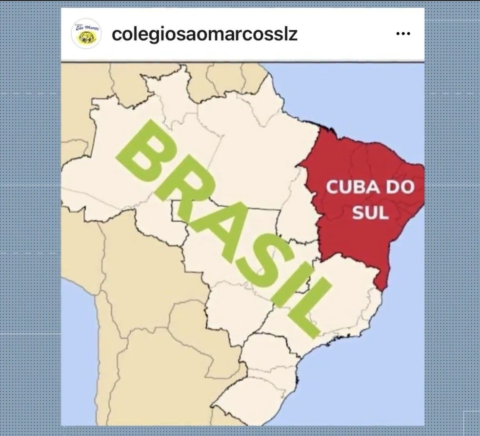 Na postagem, a região Nordeste aparece destacada no mapa do Brasil, com a indicação de “Cuba do Sul”, fazendo referência aos votos recebidos pelo candidato Lula, na eleição do domingo (2). Cuba é uma ilha que, há anos, vive política e economicamente isolada dos outros países.