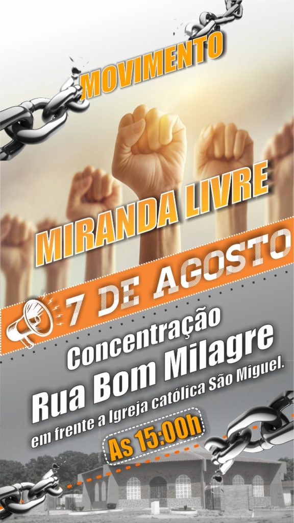 O Movimento Miranda Livre convoca toda a população de Miranda do Norte para dia 7 de agosto nos manifestarmos contra todos os problemas que temos enfrentados em nossa cidade: