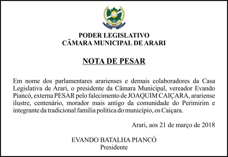 Poder Legislativo municipal de Arari, divulga nota de pesar pelo falecimento do senhor Joaquim Caiçara. O mesmo faleceu hoje(21), em São Luis. Seu corpo está sendo velado na sua residência no bairro do Perimirim em Arari.