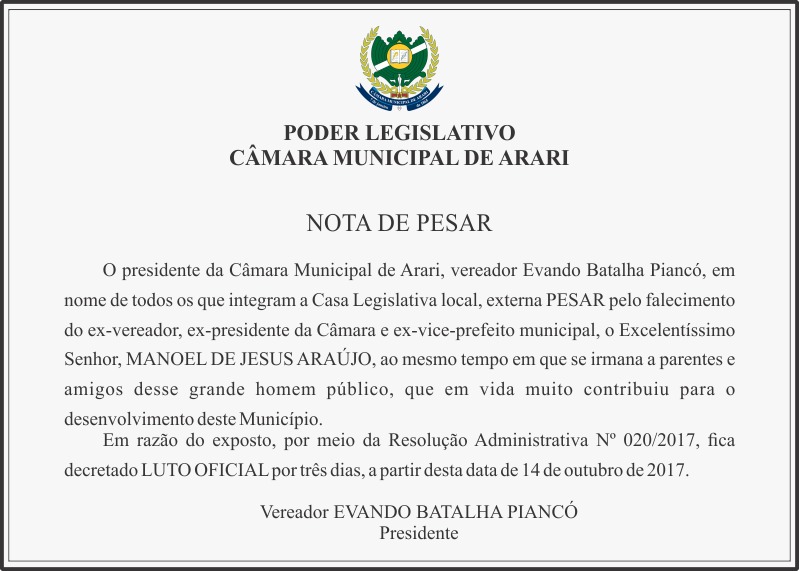 O Presidente da Câmara Municipal de Arari,Evando Piancó, decretou luto oficial por três dias em virtude do falecimento do ex vereador e presidente da câmara o senhor Jesus Araújo, neste sábado no início da madrugada em São Luis.