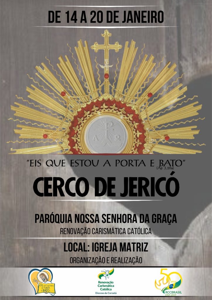 A renovação carismática de Arari estará realizando o Cerco de Jericó de 14 a 20 do corrente mês na Paróquia Nossa Senhora da Graça em Arari. O evento acontece anualmente, especificamente no mês de janeiro. Este ano tem como tema: ” EIS QUE ESTOU A PORTA E BATO.” Ap.3 20a. O Cerco de Jericó envolve todos os grupos, pastorais e a comunidade de modo geral. Será uma semana de oração e louvor ao nome do Senhor Jesus.