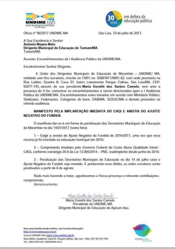 Secretários Municipais de Educação, professores, sindicatos, prefeitos e também o membros do Ministério Público do Maranhão, se reuniram nesta segunda-feira (10), no Convento das Mercês, em São Luis, e decidiram pela paralisação geral no Estado do Maranhão em função da perda de recursos do FUNDEB (Fundo da Educação Básica) devido aos cortes no repasse do Governo Federal.